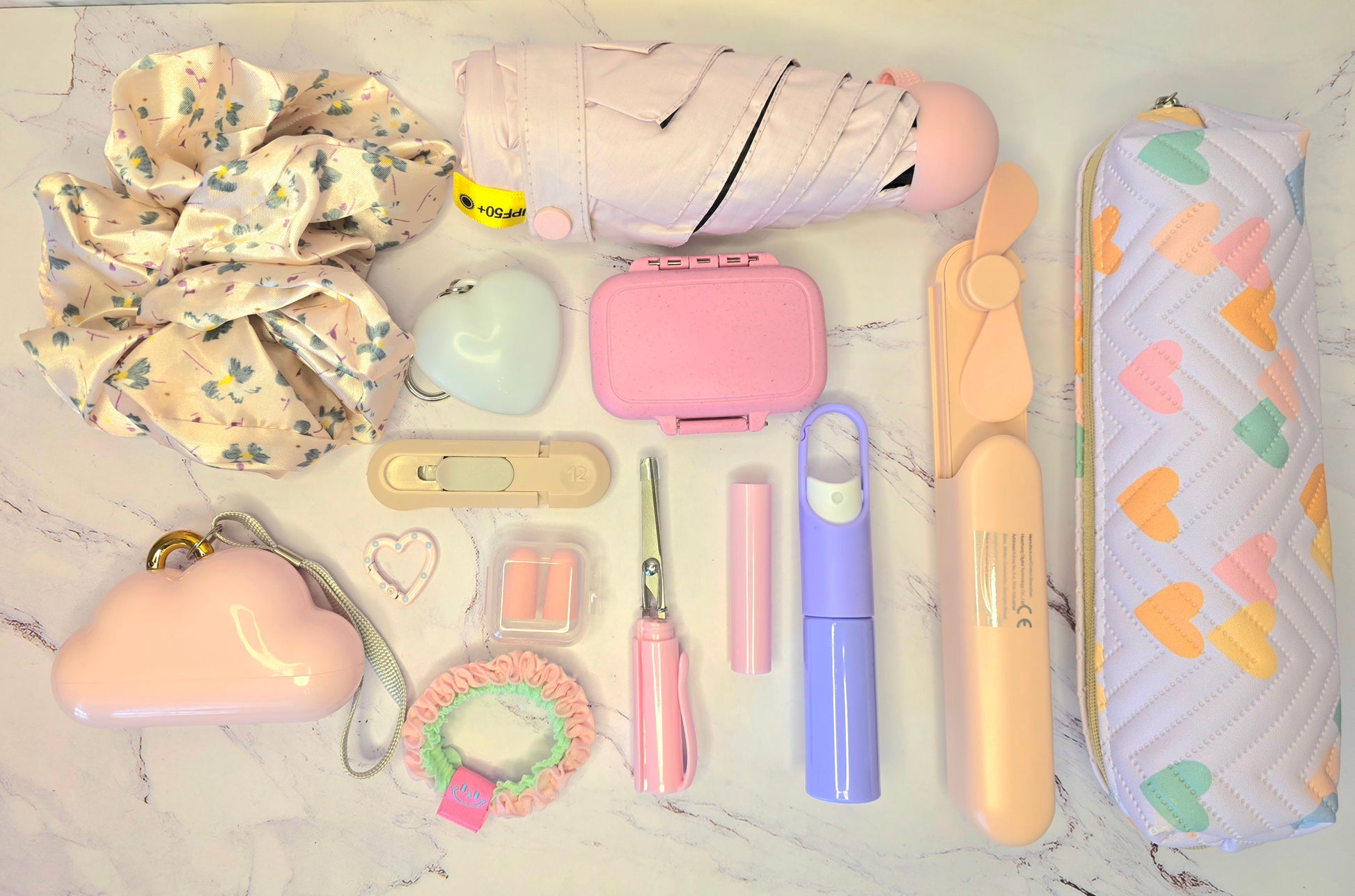 The Everyday Mini Essentials Deluxe version inlcudes everything in the Standard Version PLUS a few additional practical items: a compact umbrella, a portable/chargeable fan, a pack of car coasters, a felt car freshener in a trendy fragrance like sol de janeiro or Pink Sands and a monogrammed keychain all curated to match your chosen colorway.